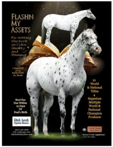 Flashin My Assets Sire: Iza Flash Of Luck, Dam: Lions, Tigers and Bears. 2019 Leopard Appaloosa Eligible for BHF Color , East Coast Halter Futurity, Appaloosa Sires, Appaloosa Halter Futurity. He is 7 Panel N/N. Homozygous ptn/1 ptn/1. Lp/1p. Stud Fee for 2025 is $250. when booking and then balance when foal stands and nurses.