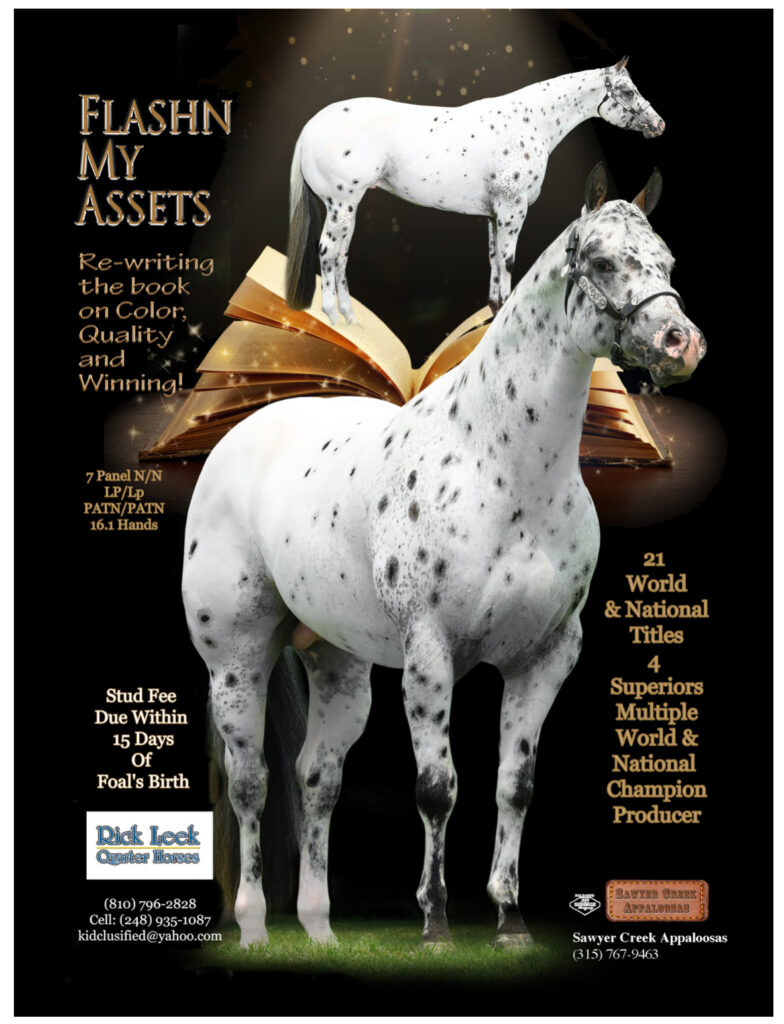 Flashin My Assets Sire: Iza Flash Of Luck, Dam: Lions, Tigers and Bears. 2019 Leopard Appaloosa Eligable for BHF Color , East Coast Halter Futurity, Appaloosa Sires, Appaloosa Halter Futurity. He is 7 Panel N/N. Homozygous ptn/1 ptn/1. Lp/1p. Stud Fee for 2025 is $250. due when booking. Balance due within 15 days when foal is born and nursing.
